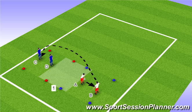 Player A throws the ball up for B to head over the shaded area to C, who catches and throws the ball to D.