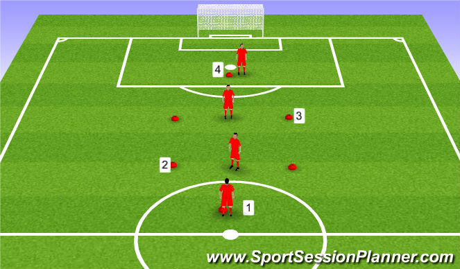 -1 plays to 2 on their back foot who plays to 3 on their back foot who plays in to 4. 4 dribbles to end everyone moves one cone.