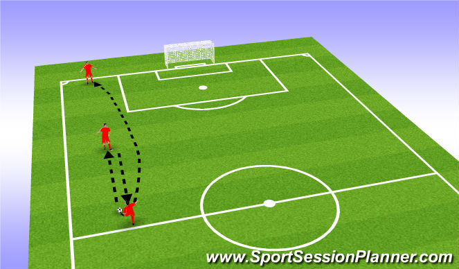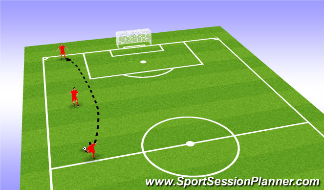 Player A passes to player B. When this first pass from player A is hit the defender (D) runs in to shut down player B. Player B sets the ball back for player A who lofts the ball over the top for player B to run onto. The defender must chase down the ball. The aim is for player B to bring the ball down under control before they reach the byline without the defender winning the ball.