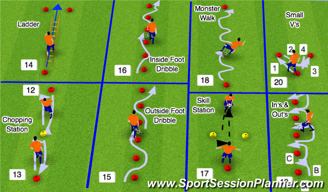 12/13 - Chopping Station. Each player starts on red cone dribbles to yellow cone & chops with left, then dribbles to red cone & chops with right. Repeat., 14 - Ladder. 1's, 1/2's, R leg hop, L leg hop, two foot hop, North two foot hop, South two foot hop, forward shuffle, reverse shuffle, 15- Outside foot dribble, 16- Inside foot dribble, 17-Skill Station - A serves headers, thigh balls, chest balls & cup traps. B controls & returns ball, 18- Monster Walk - Dribble in bigh steps w/ball, 19- In's & Out's - Face sideways: A Pull, B Roll Across, C Lace Chop Forward, 20- Small V's - Lace/Pull L. Lace/Pull R.