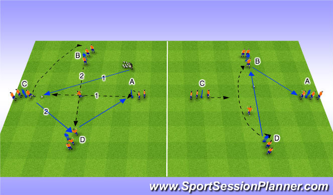 Progression: Pressuring player takes away one passing option by arcing angle of approach. Passing players must make decisions on which directon to pass & move to opposite line as if emptying out space.