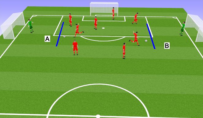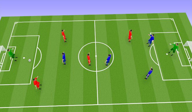 Unopposed free kick technique, free kick with opposition and small sided game with extra focus on free goals which are created by coaches timer and rewarded with 2 goals instead of 1 for a goal from a free kick.