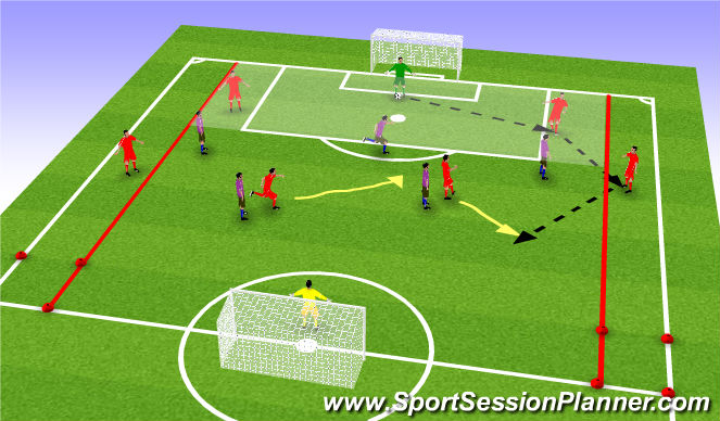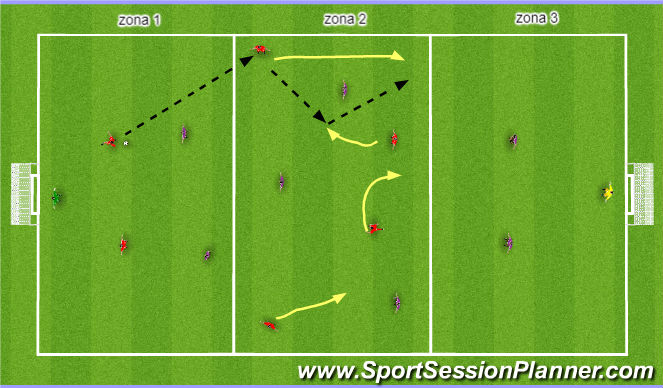Tenemos 2 zonas, en la de inicio 4:3 y en la de finalización 4:4 esta igualdad la pueden romper rojos entrando lateral o central con balon conducido ( siempre mantenemos 3 jugadores atras )