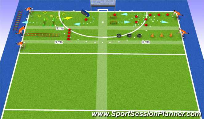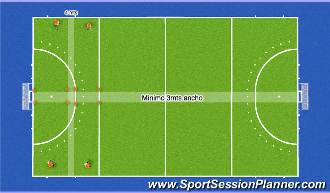 En estos ejercicios se plantea una zona de 6mts de ancho para cada jugador con una zona de 3mts neutra para separar del jugador de al lado. Por lo tanto trabajan 24 jugadores en cancha, individualmente y sin tener contacto alguno.