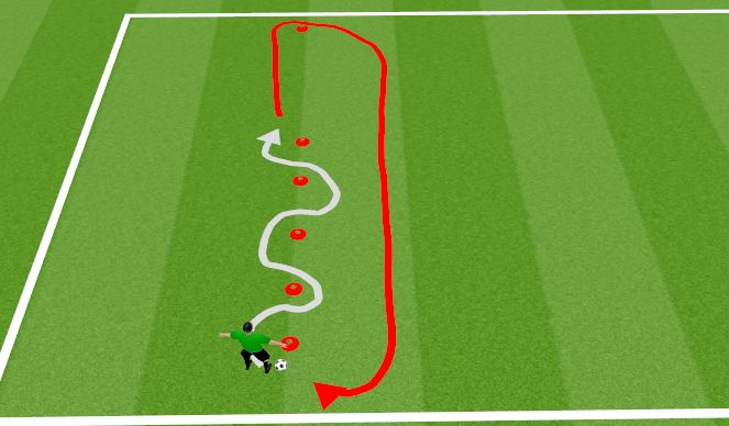 Dribble through the cones before driving WITH MAX PACE to the end cone, round it with possession and then drive at medium pace back to the start.Do 3 sets x 3 reps with 1 minute rest between each set