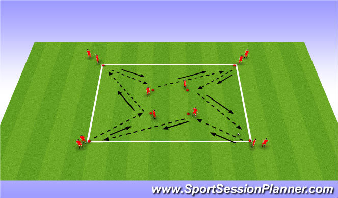By having a player drive in with a new ball a high tempo is immediately created and the awareness of all players is hightened both inside and outside the grid.