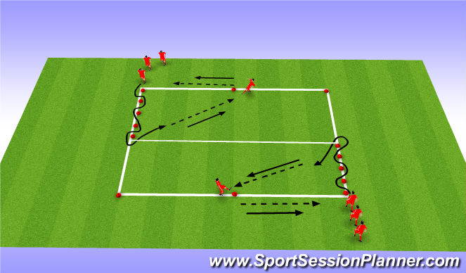•Like Exercise 2, except now, after the second diagonal pass, the player at the corner cone kicks a square pass along the endline (to the other group). passing and dribbling 3