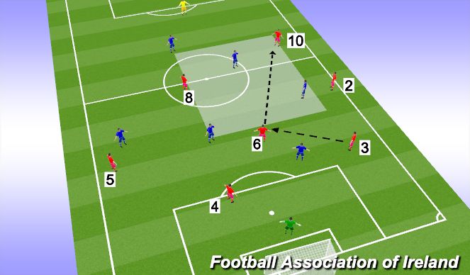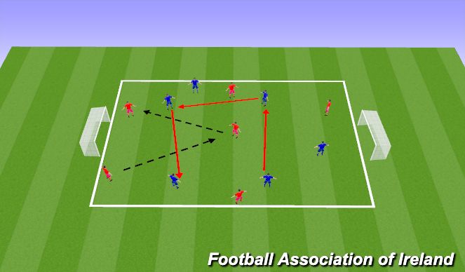 The players must make 5 successful passes before shooting at the blue or red goal. The coach will call out either blue or red when one team makes 5 successful passes.