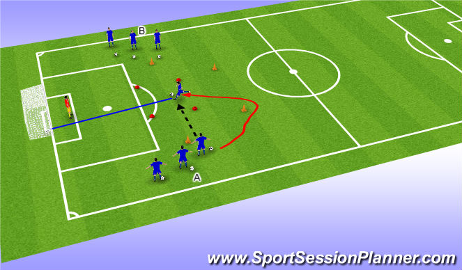-Player A runs onto the pass in the corner box and plays a firm pass ALONG THE GROUND using the top centre of the 18 yard box as the target area.