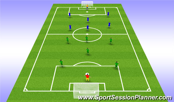 Equipment: 9 cones, 9-12 players, goalie, supply of balls, net