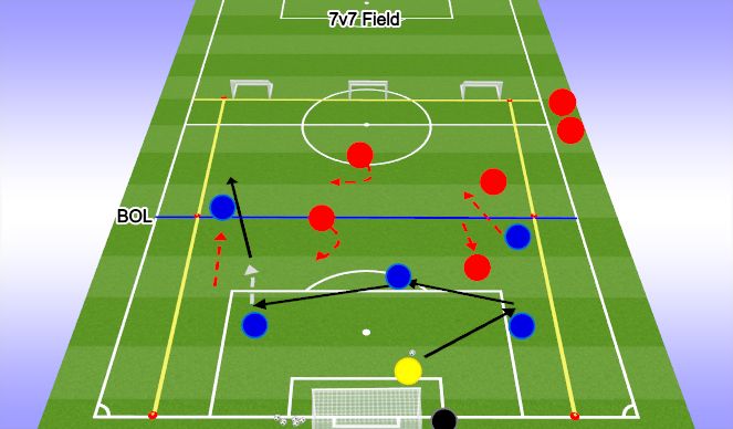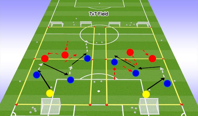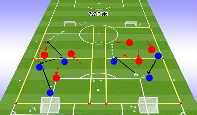 OBJECTIVE: To dribble or pass the ball forward.PLAYER ACTIONS: Pass/dribble forward, Spread out, Support the attack.ORGANIZATION: In a 7v7 field (40Wx60L) play 6v6. The Blue team will play in a 1-3-1-1 formation and the Red team will play in a 1-1-3-1 formation.SKILL ACQUISITION: Passing, receiving, and dribbling.KEY WORDS: Opening, Forward, Possess, Help.GUIDED QUESTIONS: 1. How can you get the ball though an opening? 2. What can we do to create an opening? 3. When you do not have the ball what is your role to help the attack?ANSWERS: 1. Dribble or Pass the ball forward - 2. Spread out - 3. To support the attack and create passing options.Note: All Laws of the game and US Soccer Player Development Initiatives (PDI) are in effect.