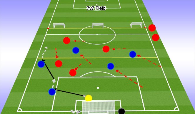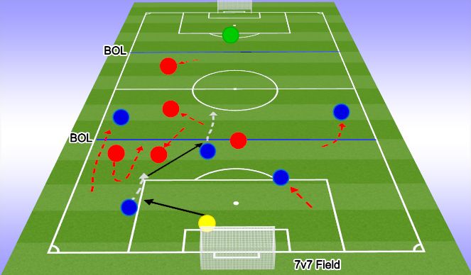 OBJECTIVE: To pass or dribble the ball forward into the opponent’s half.PLAYER ACTIONS: Pass or dribble forward, Spread out and Support the attack.ORGANIZATION: In a 7v7 field, set up a 40Wx35L playing area with a regular goal and two 10yard dribbling gates and a gate guard. The 5 Blue players: the GK, 3 defenders and 1 midfielder against 4 Red players: 3 strikers, 1 midfielder. Blue team scores by dribbling through either gate. Red scores in the regular goal. Play with a build out line. All Laws of the game in effect. If the Red team scores, the Blue team gets a goal-kick to restart the game. Rotate players every interval.SKILL ACQUISITION: Passing, receiving and dribbling.KEY WORDS: Wide, Opening, Forward, Possess, Help.GUIDED QUESTIONS: 1. How do we move forward with the ball? 2. How can we create openings? 3. What do you need to do if you do not have the ball?ANSWERS: 1. Dribbling it or passing forward - 2. By spreading out - 3. Support the attack and create passing options.