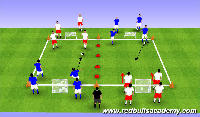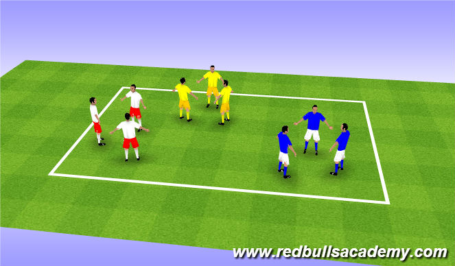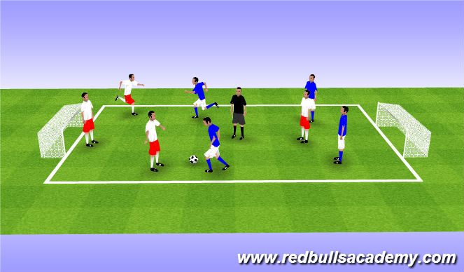 Defending team passes the ball to the attacking team. two attackers and two defenders go out for a 2v2 game for 30 seconds or a goal