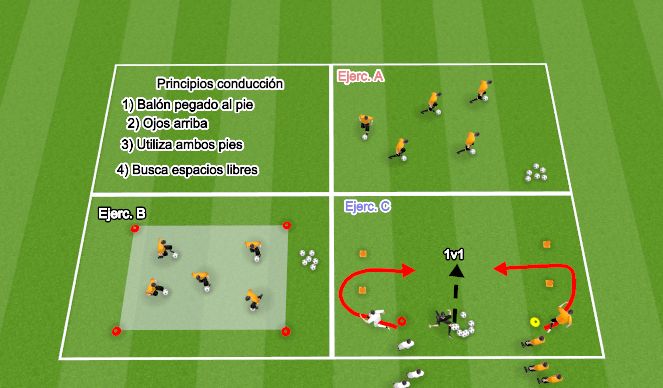 Lo primero es esplicar a los jugadores los 4 prinicpios que tenemos que realizar con la conducción.(Realizar un ejemplo)Ejerc. A-> Los jugadores por todoel campo con un balón, y cada vez que el educador nombra un de los principios ellos lo destacan más en su conducción.