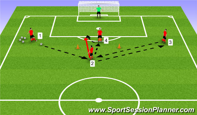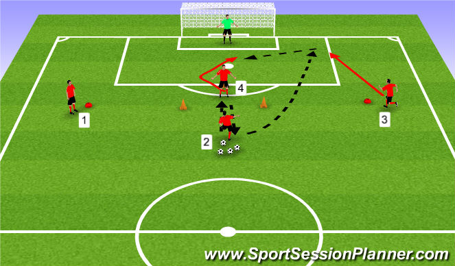 Using the same layout but this time focusing on the number 9 (marked 4) movement in the box for a cut across the siz yard box. 2 initiates with a one-two then plays to 1 or 3 who run down the line to meet the ball. 4 has to then arc their run and call where they want the ball for 3 to cross and score.
