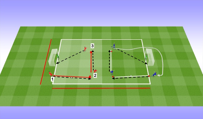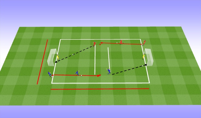 The practice starts when Player 1 attacks the cone performs a body feint and shoots at goal. After shooting he must transition quickly from Attack to defence and sprint across the square to defend against player 2.