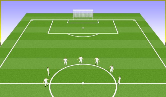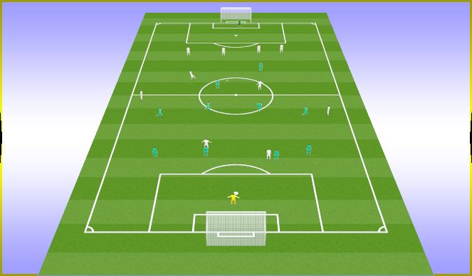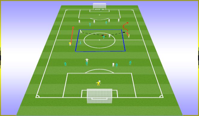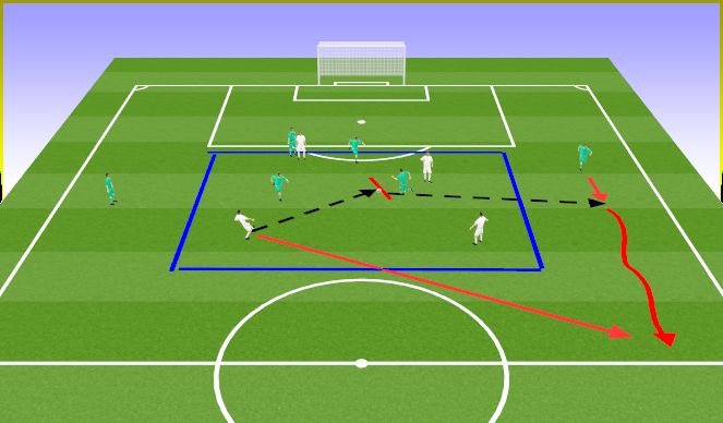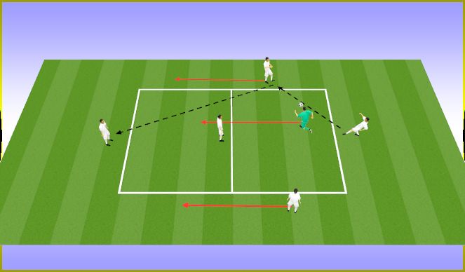 Se juega en el cuadrado delimitado un 4x4 en 25x25m. Equipo blanco inicia en posesión del balón, anotando punto tras realizar 6 pases consecutivos. Si equipo verde defensor roba el balón, juega con uno de los jugadores exteriores, que tendrá que llegar en conducción a línea de medio campo, antes de que el jugador blanco que perdió balón le alcance.