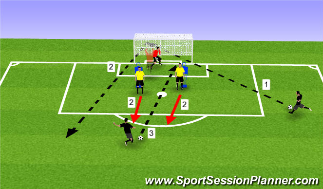 1-El ejercicio comienza con un centro lateral, donde los jugadores de amarillo también podrán obstaculizar el blocaje, debiendo el portero rechazar a una zona adecuada.