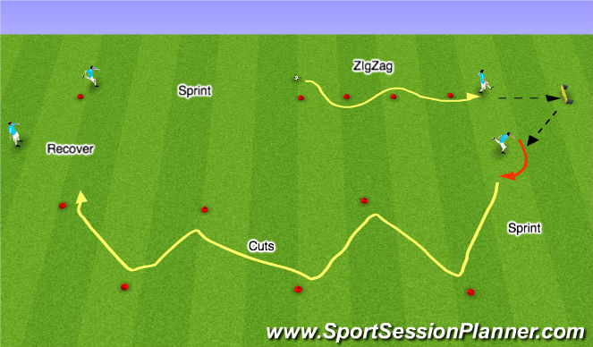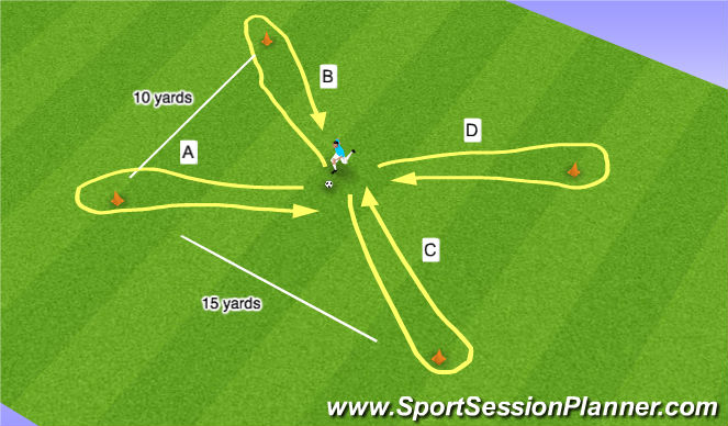 A. Players Juggles the ball 15 times then sprints, goes around the cone and comes back to the center.