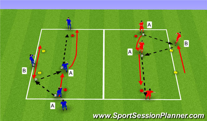 Instruction: Player A will start with the ball at their feet at the red cone. Player B, starting at the further yellow cone on the side, will check and look to receive a pass at an angle with their body "side on". Players A and B will execute a WALL PASS, with Player B using 1 touch to direct the ball forward and Player A runing into open space. Player A will then play a pass to the waiting player at the other end of the area. Activity is repeated (repitition)