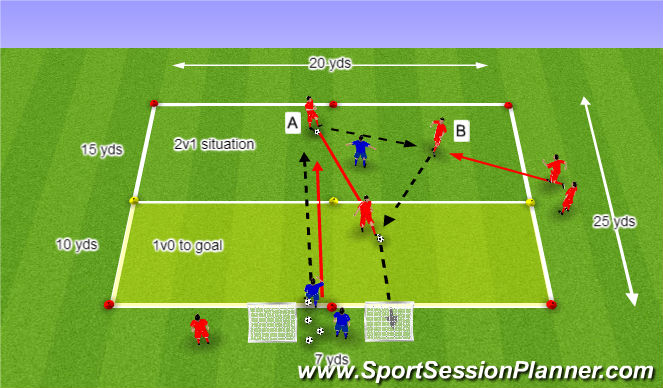Organization: 6+ players, 4+ attackers, 2+ defenders; 25x20 yard field (15x20 yard area, 10x20 yard area)