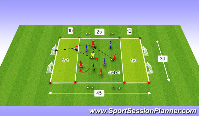 Organization: 9+ players, 4v4 + 1; 45x30 yard field