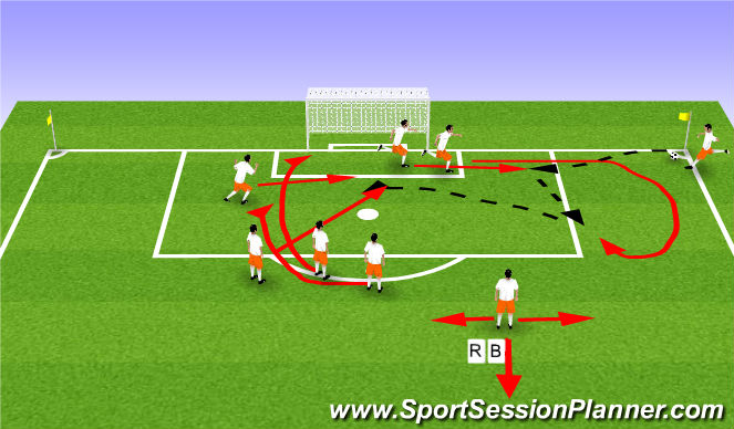 4 Players line up at the top of the 18 and make crossing runs as shown in the diagram. 1st post player checks out to clear space. A player lingers on the back post for a over hit ball. One player is on the GK to obstruct her view.