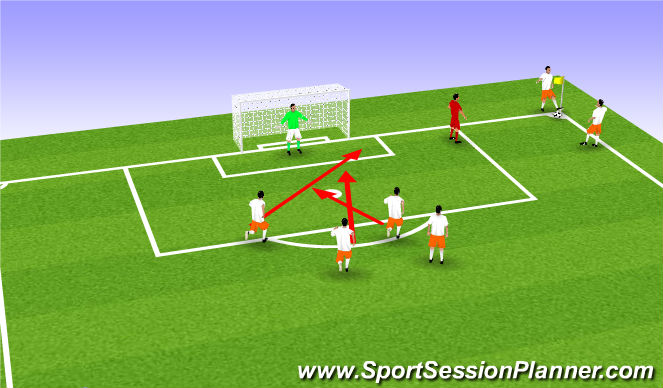 4 Players line up in between the 6 and 18 along the side of the box. Kicker holds hand up for signal and gives players time to peel their runs into the box. 2nd player in line checks to ball for short option if they want.