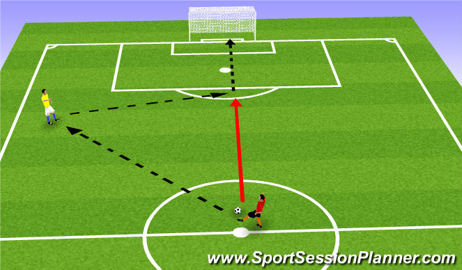 Players line up by centre circle. They then play a pass out wide to 'winger' (probably a coach) who will then either pass the ball back or cross the ball in for the player to control the ball and have a shot on goal.