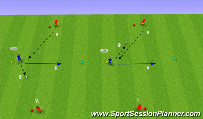 - Pass and move. Player receiving the ball must screen for teammate outside of the field (reference player) and call the number before receiving the ball.