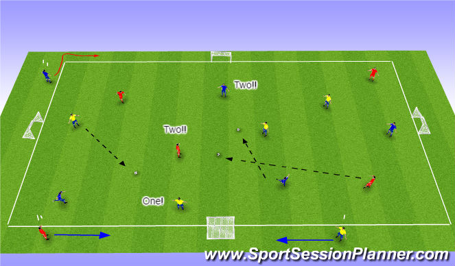 - Far away target pass the ball. Closer target to central player (blue) Puts one or two arms up.