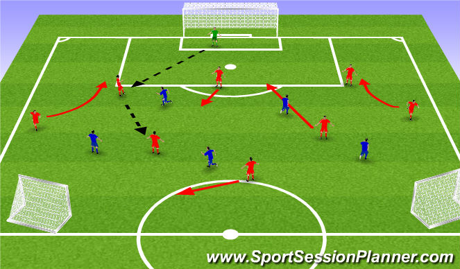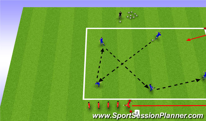 Once a Blue player has the first touch, a Red player sprints around the outside from gate 1.