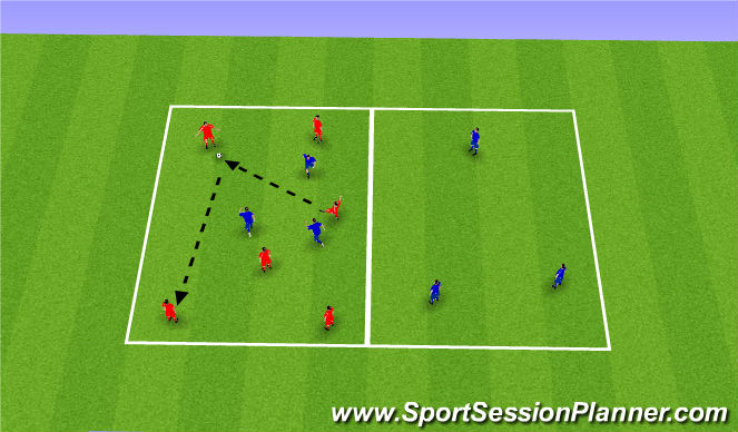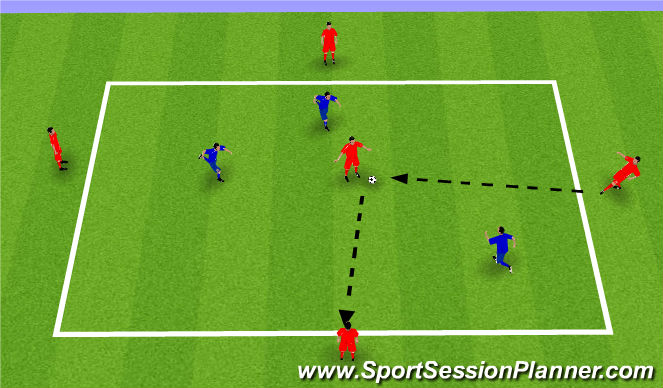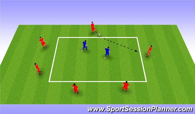 6v2 Possession square, player who loses possession (and player to the left) go into the middle. Ball must be moved quickly, splitting the defenders if possible.