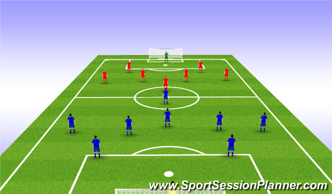5v3 Possession game, Reds must keep possession, and when possible use the player in the middle. Blues can press outside players but can't tackle. When they win the ball back, they must make 5 passes, then play back to the outside.