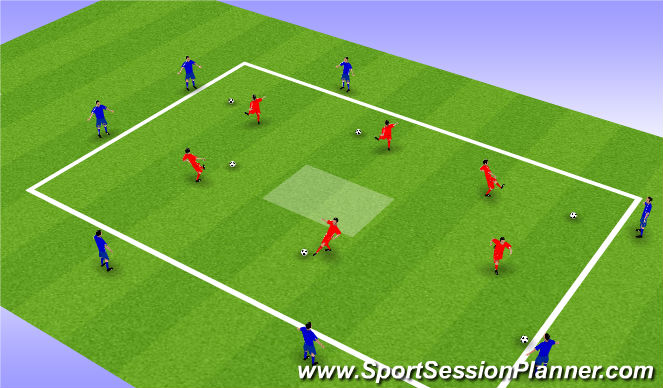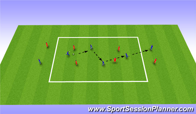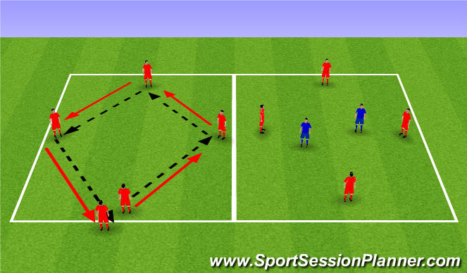Set Up: Half the group around the outside. Half in the middle with the ball. Receive play back. Progress into switchin the play. Must travel through the middle square each time.