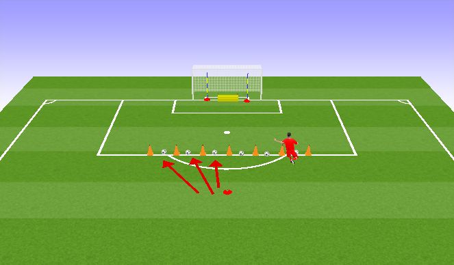Players start on the cone and shoot the balls into the goal. 3 on the right side of the goal the the right foot, 3 balls on the left side of the central cone with the left foot.