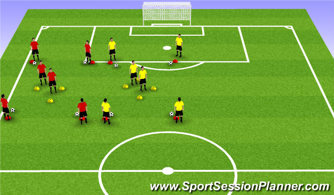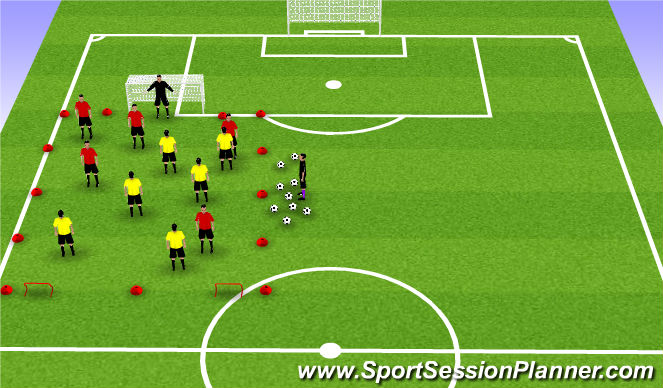 Working players run out to a server perform skill then run back through box in the middle, player must exit through a different gate to the box which they came from