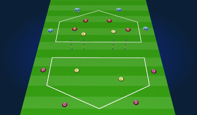 - a 4 csapatból 3 tartja a labdát, rajzon az A, C és D csapat, ahol az egyik csapat két részre van választva, jelen esetben C csapat