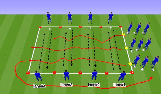 10. Progression: Now allow the passers to try to hit the dribblers ball. The passers must still keep the passes in their own lanes.