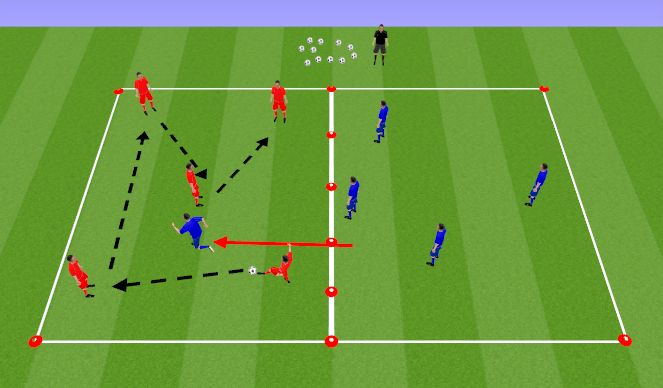 1. Have the red team start passing within their own grid. Send in a blue defender immediately to press and try to win the ball and dribble or pass the ball back to their own grid.
