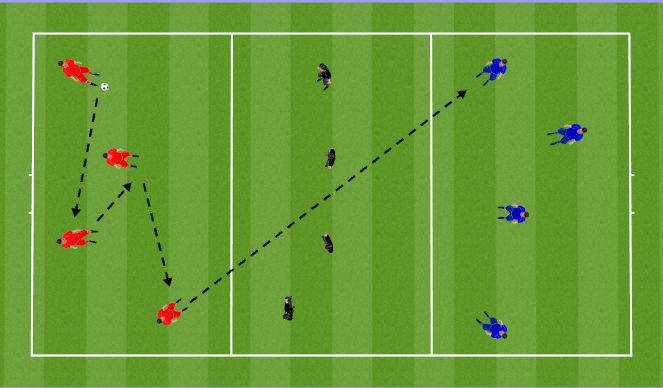 1. Start with the red team passing the ball within their own grid until they can find a pass through the defenders to the far grid. If successful 1 point is awarded.