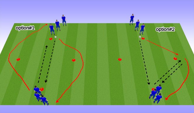 4. In option#2, the first player in line passes across to the opposite side, then runs to the right cone and stops to receive a pass back, controls the ball and passes back then runs to the back of the opposite line.