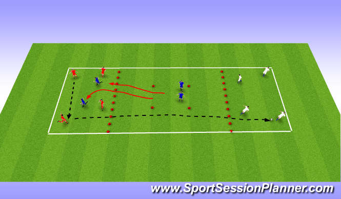 Organisation: Overall area size is 20x60 this is split putting a team in a area of 15x20 either end, which leaves a middle area of 30x20 in the middle, in this middle area, there is a defence box that is 5x5. Aim of game is players in box A have to pass the ball to Box C, but they have to make minimum of 3 passes in their own box first, they must do this under the pressure of having 2 Defenders trying to stop them making the pass, who are released from thier gate as soon as ball is in the area. Once ball is passed to next box succesful, defenders have to get back into thier gate before other 2 defenders can leave and close other box down. Once a team loses possesion, they become defensive team. Coach to keep a supply of balls to make tempo of game fast. Can progress this game by making A and C area smaller, make minimum passes 5, and even allowin remaining 2 defensive players be able to stop the long pass in the middle box.