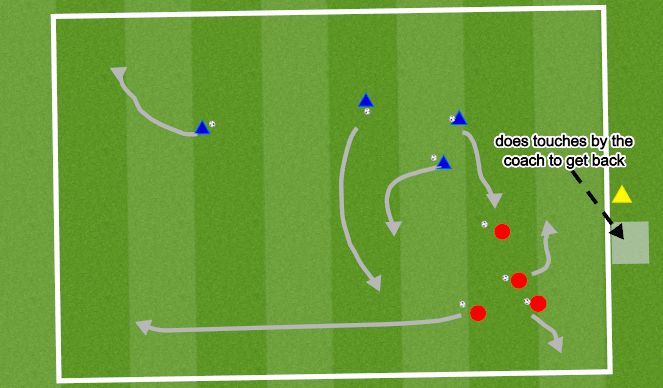 coaching points-change of direction and speed, dribbling long to get away into space, smaller touches to change direction, awareness, head up