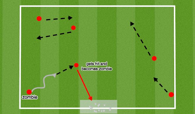 1 zombie starts with a ball and kicks ball below the knee, everyone else does not have a ball if you get hit you get a ball and start being a zombie by getting a ball in the zone.
