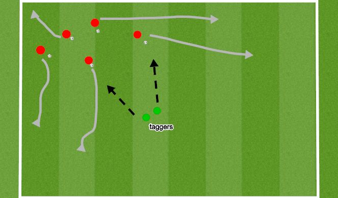 2-4 taggers depending on numbers without a ball to tag on the shoulder or arm rotate taggers after a while, you get tagged and you must do touches (foundation, hops over the ball, rolls, cuts, bounce juggling)