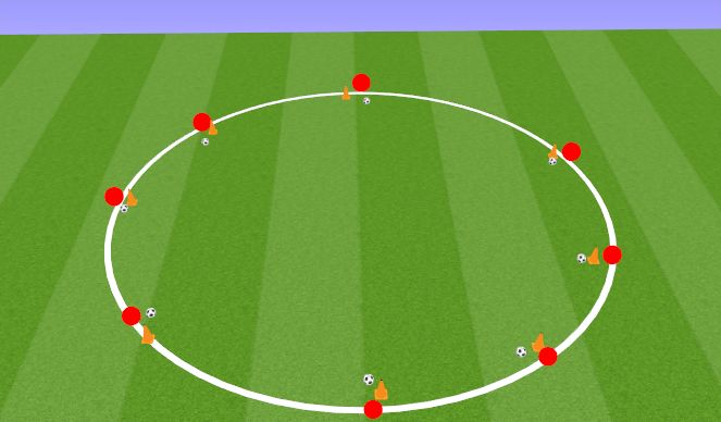 Coach calls out "show me" foundation, toe taps, around the cone, bounce juggle, cuts, rolls, moves etc. players show around their cone. Can make it fun at the end -silly dance, freeze, something a kid says