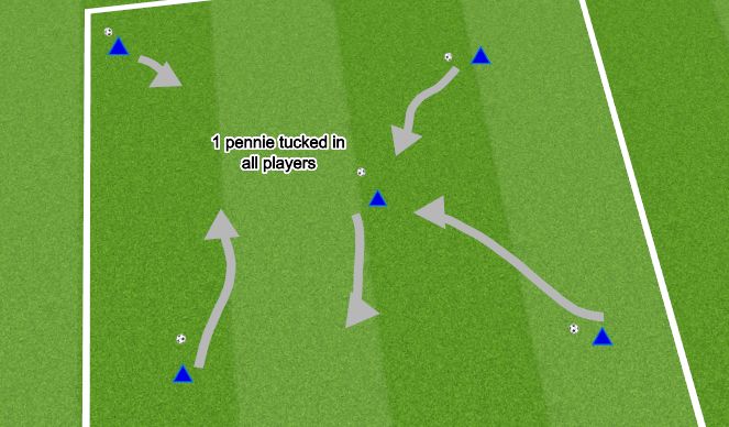 everyone has a ball, dribbling around and trying to get the pennie tucked in their shorts, get as many as you can, if you get one from someone else tuck that in too, no eliminations, keeping going with several rounds. Someone can win the round with the most pennies at the end