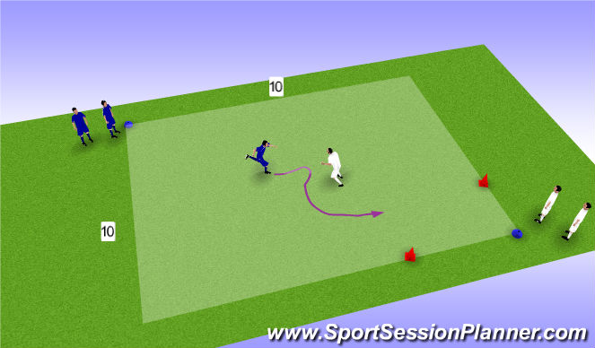 Players work in pairs. White player plays the ball across the grid to black player and closes the space down quickly. Black player must try to dribble past the white player and try and knock the ball off the cone or dribble across end line. White player defends them and tries to win the ball and dribble across opposition end line.