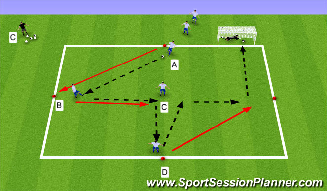 - Player A starts the excercise by passing out wide to Player B who moves off the cone and passes inside to Player C. Player C passes to Player D who moves off the cone and returns the ball straight back (one-two). Player C moves across and plays the ball into Player D's path who runs for the ball played into space and plays into GK hands or feet and progress to a shot on target.